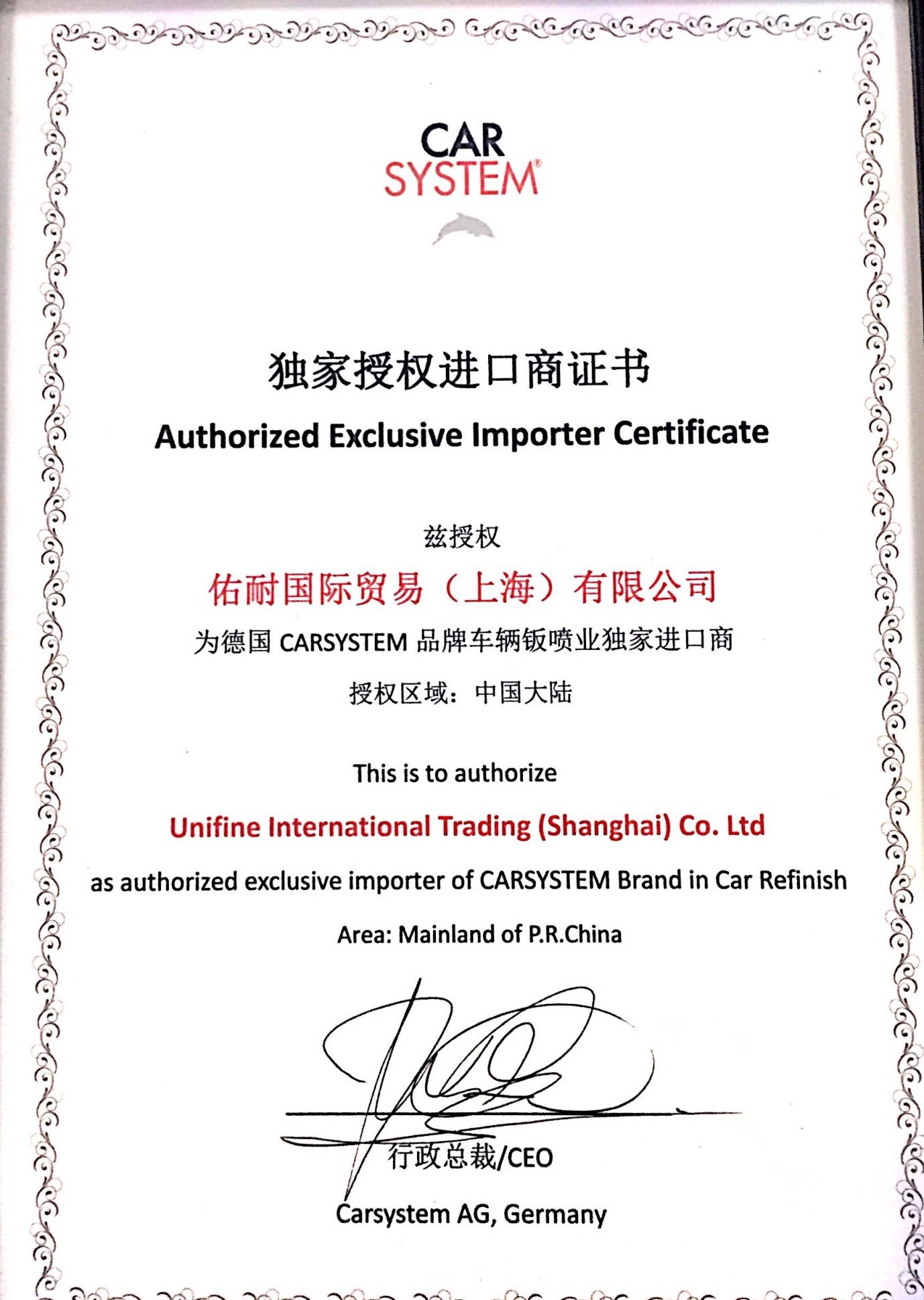 同時,在2018年,我們也通過來自德國的鈑噴輔料領導品牌-德國CARSYSTEM(海豚)嚴謹而長久的認證,正式成為他們在中國大陸汽車業的總代理商,一起為強強聯手共同開拓市場服務客戶而努力。
